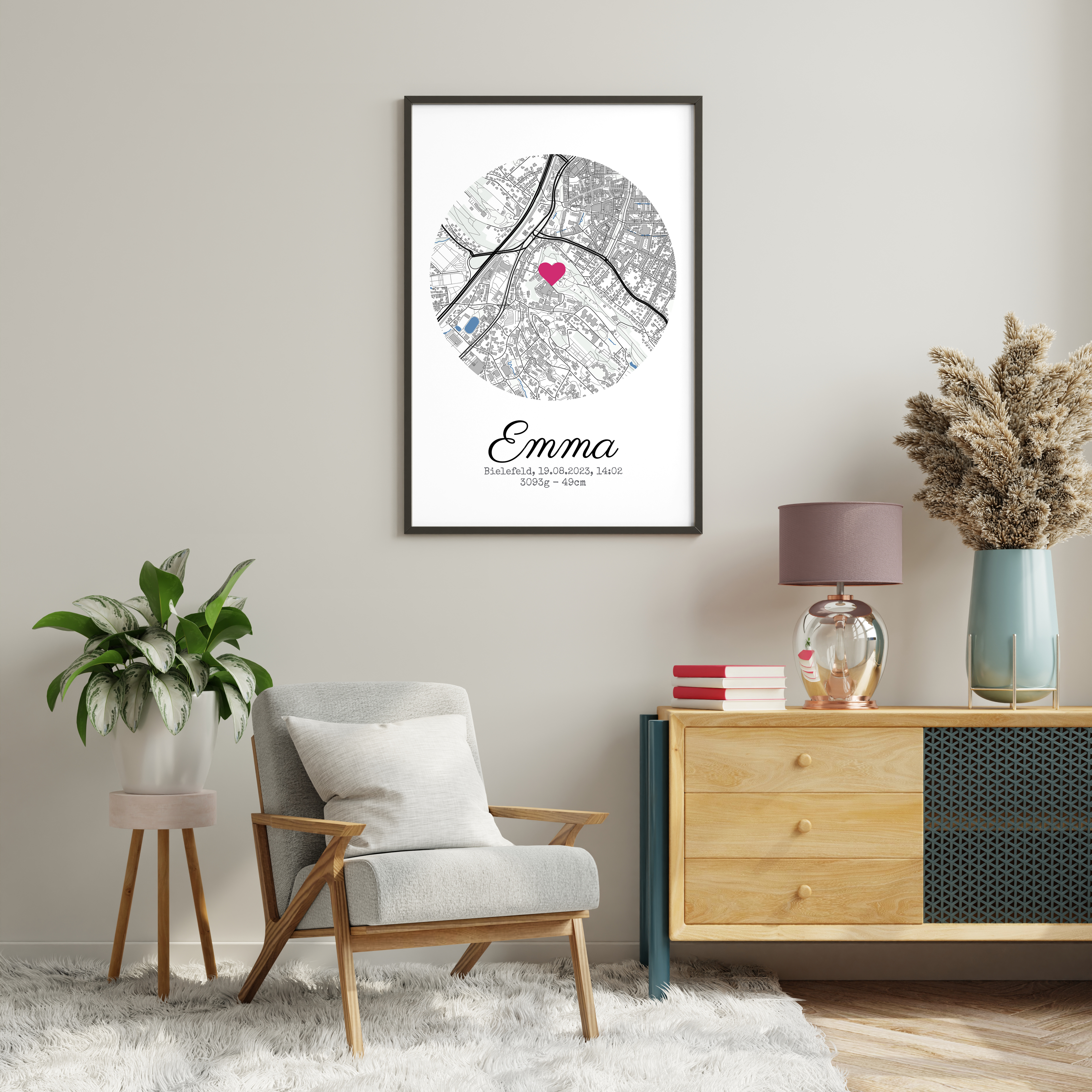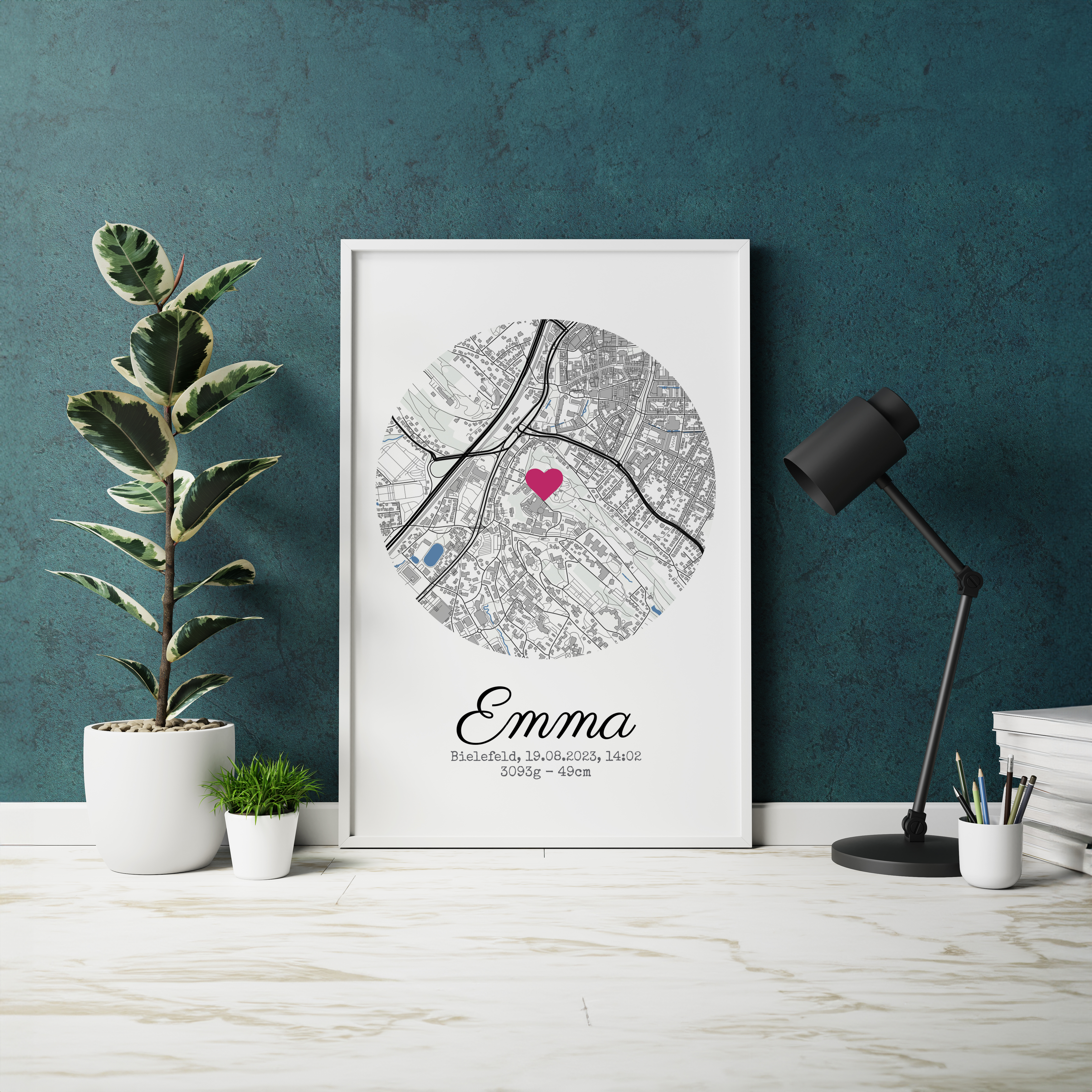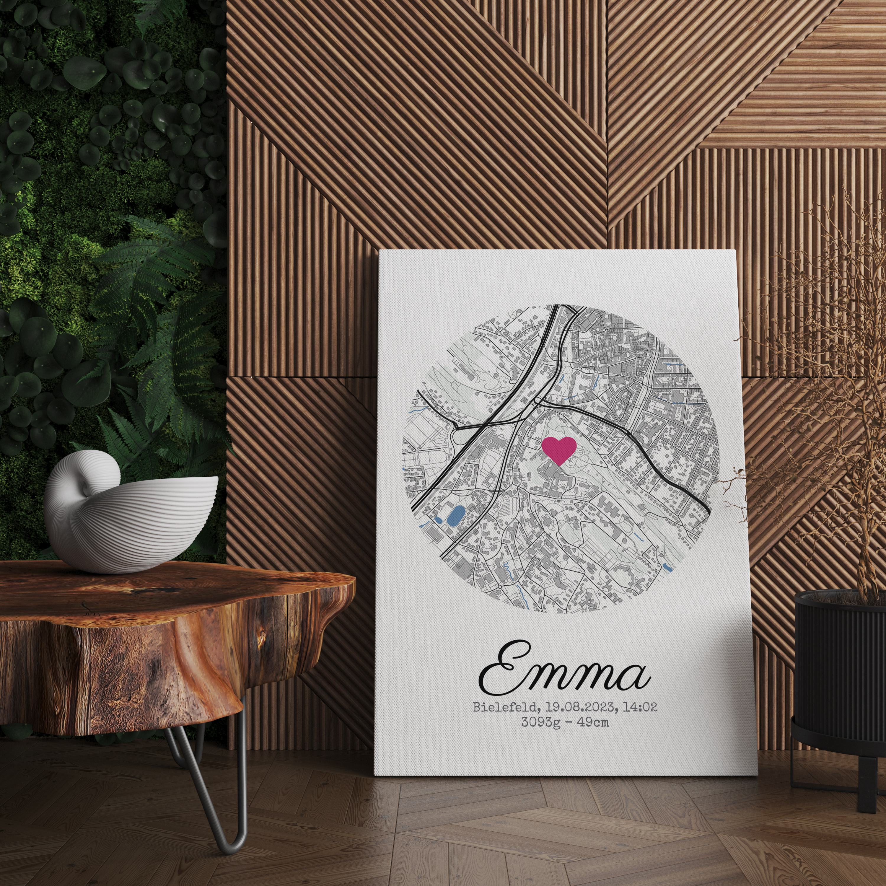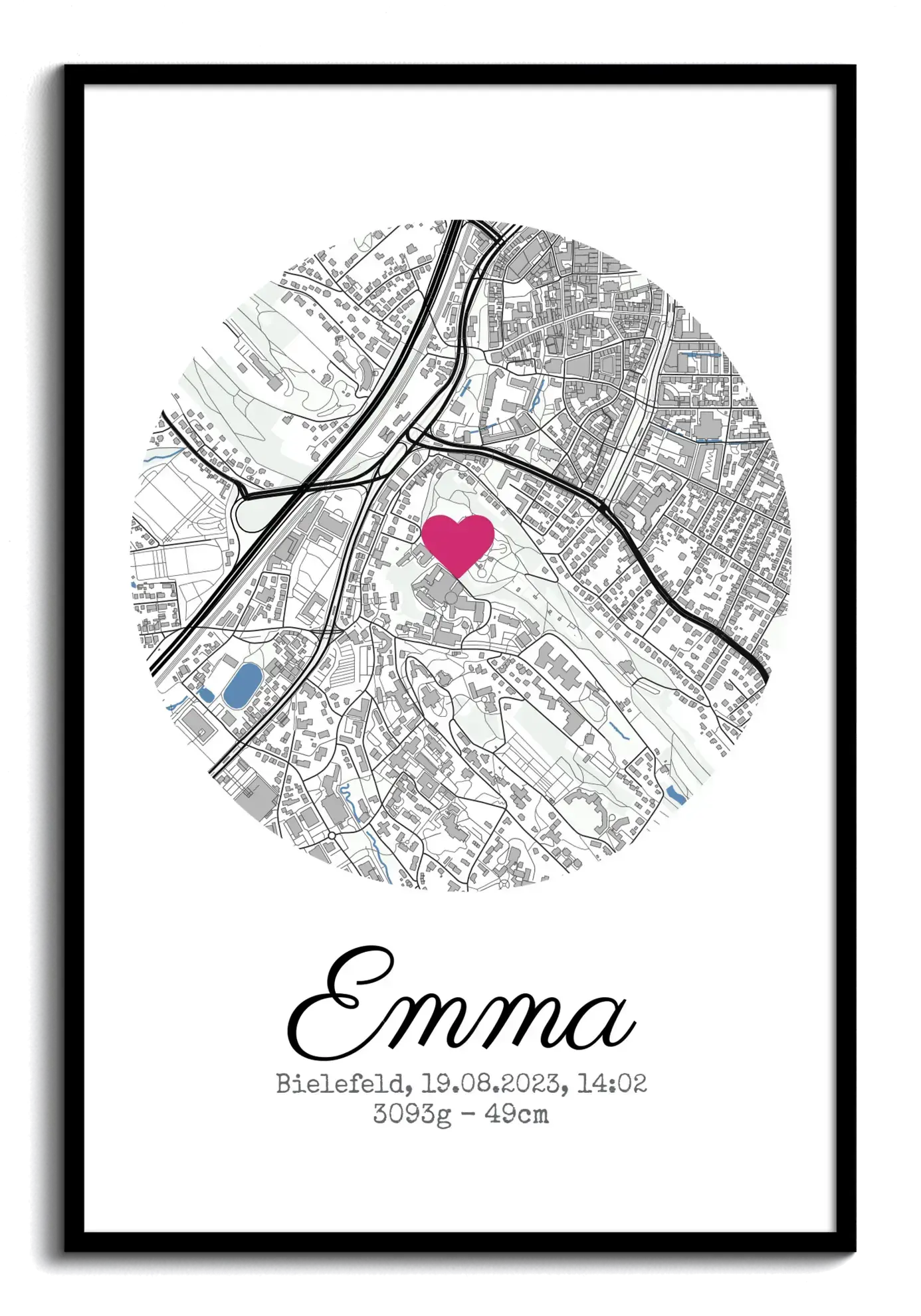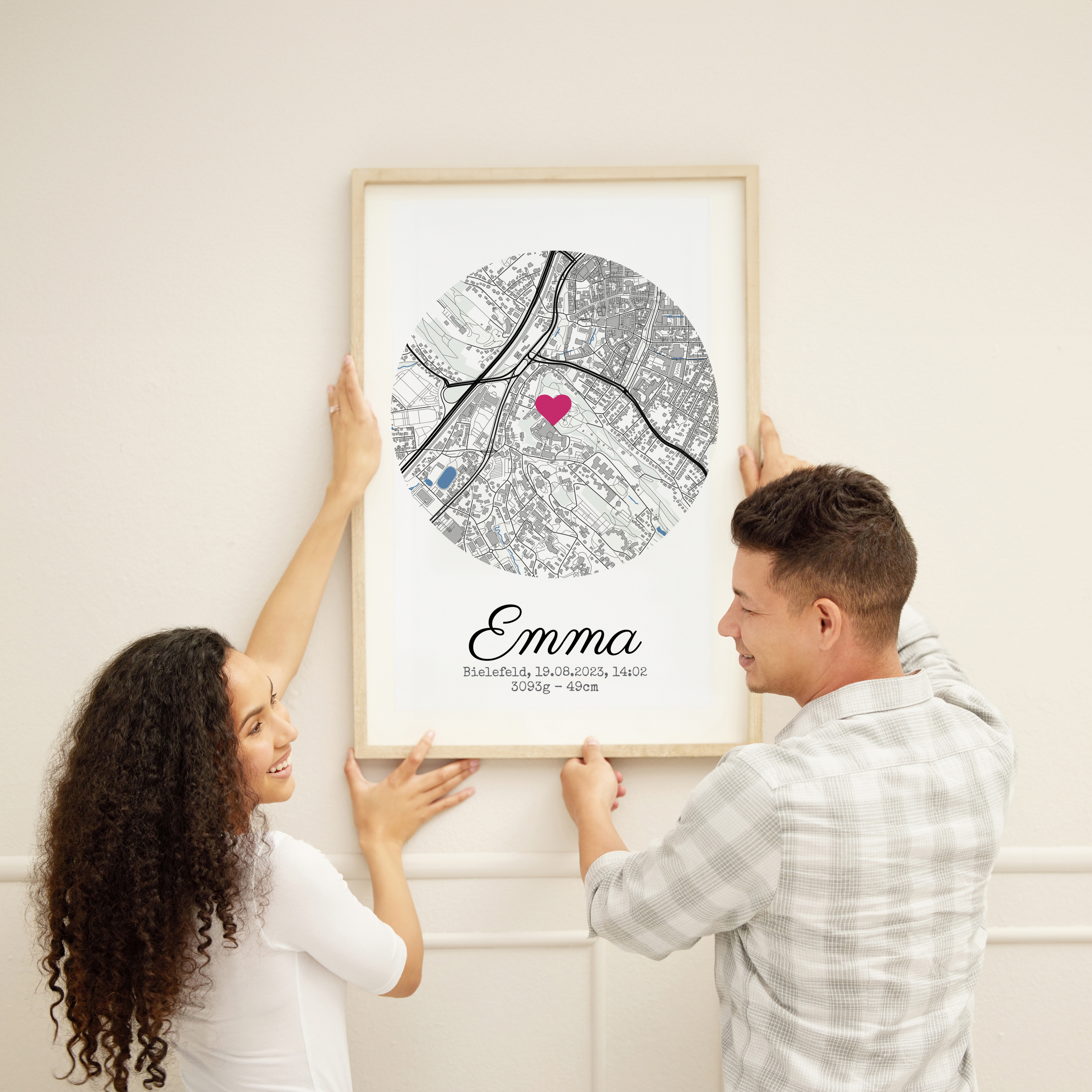 Personalisiertes Geburtsposter mit Stadtkarte, Namen, Datum Uhrzeit, Gewicht und Größe des Kindes. Druck als Poster, Leinwand, Acryl oder Dibond