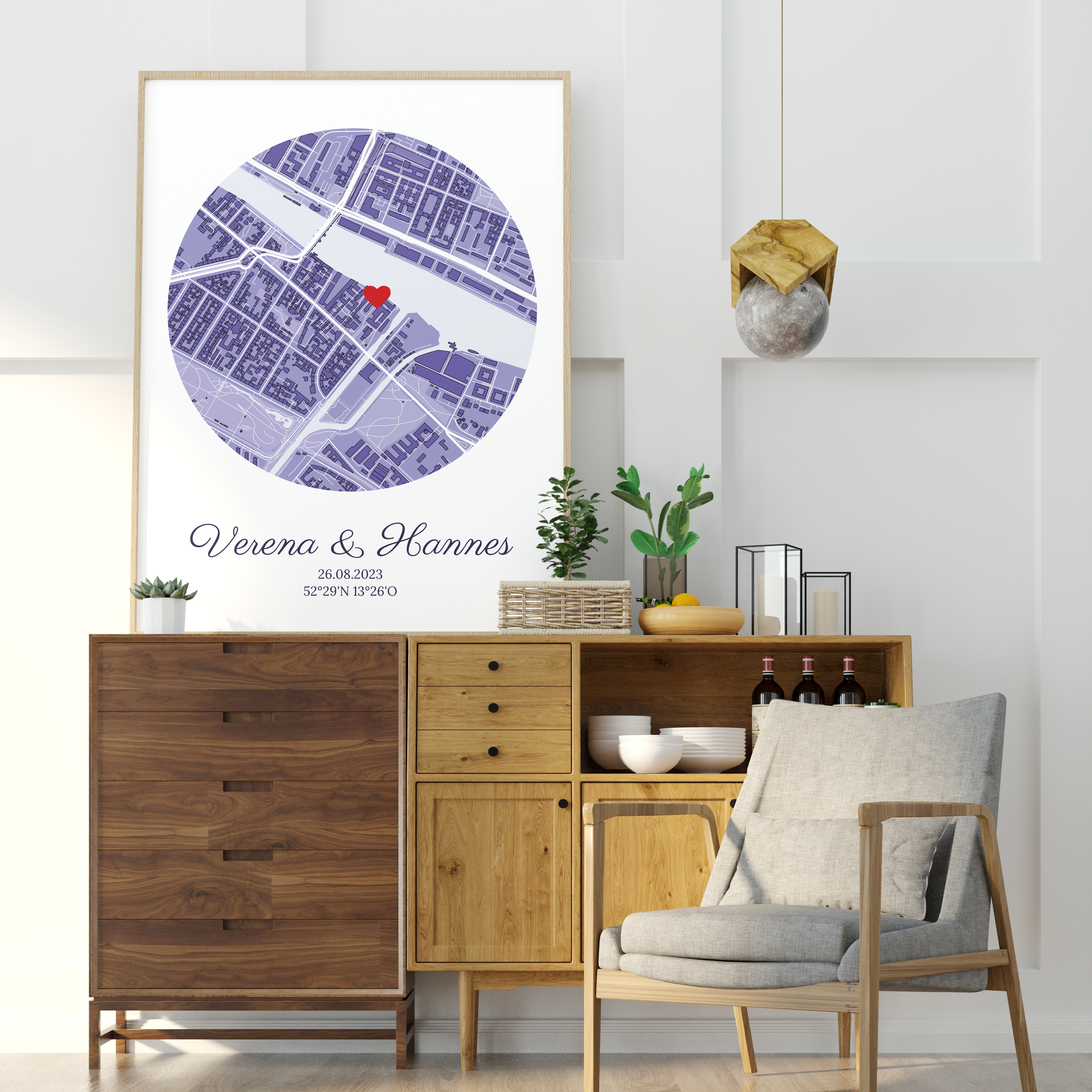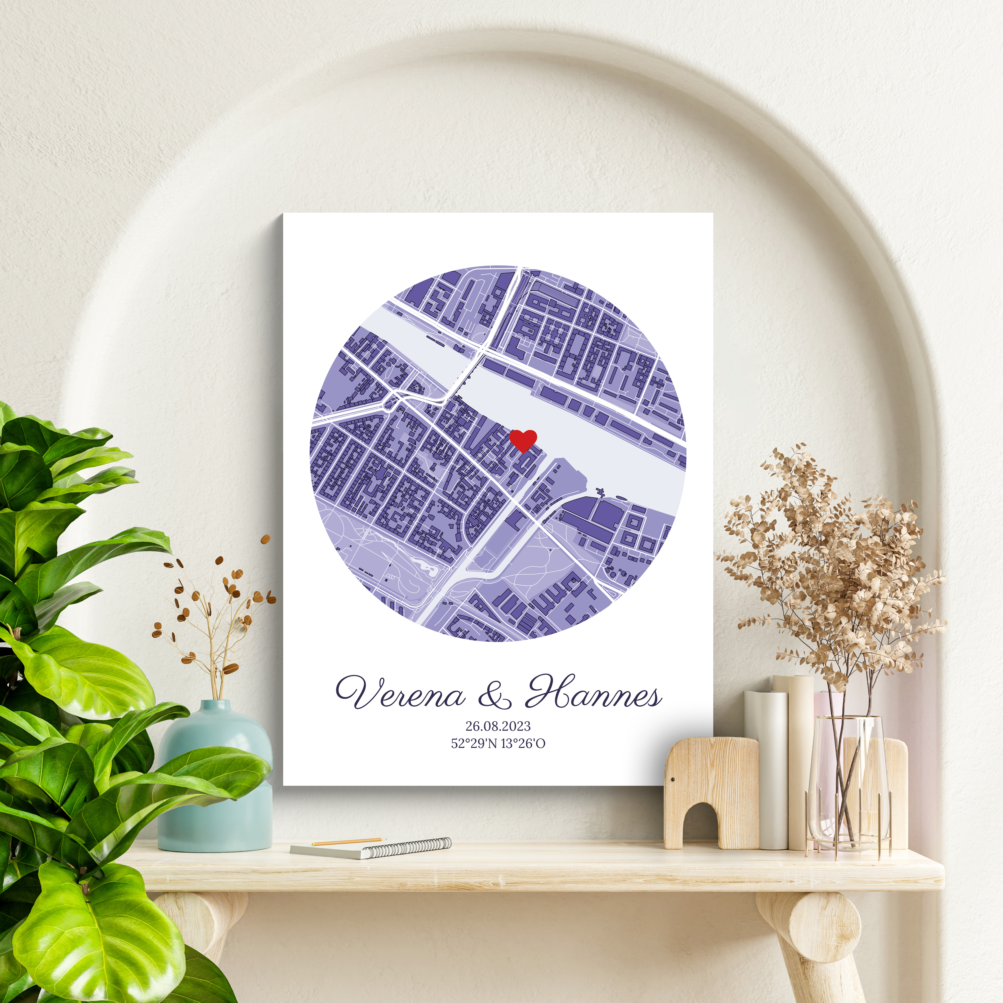 Individuelles Poster zur Hochzeit. Ort der Trauung auf Landkarte markiert mit Namen des Brautpaars. Druck als Leinwand, Poster, Acryl, Alu-Dibond