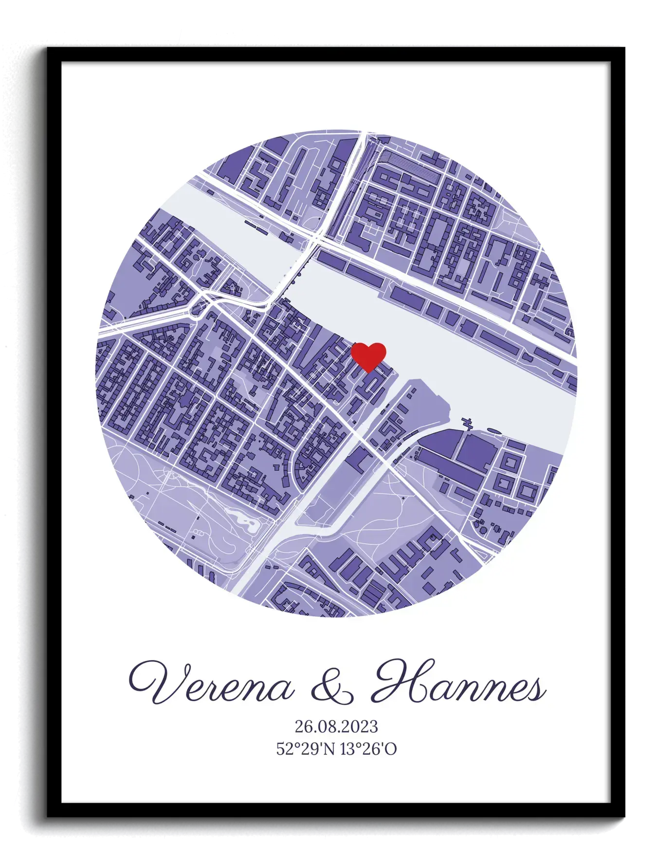 Erstelle eine bleibende Erinnerung an deinen besonderen Tag! Eine personalisierte Hochzeitskarte zeigt den Ort der Trauung, markiert mit einem Herz und den Namen des Brautpaars sowie dem Hochzeitsdatum.