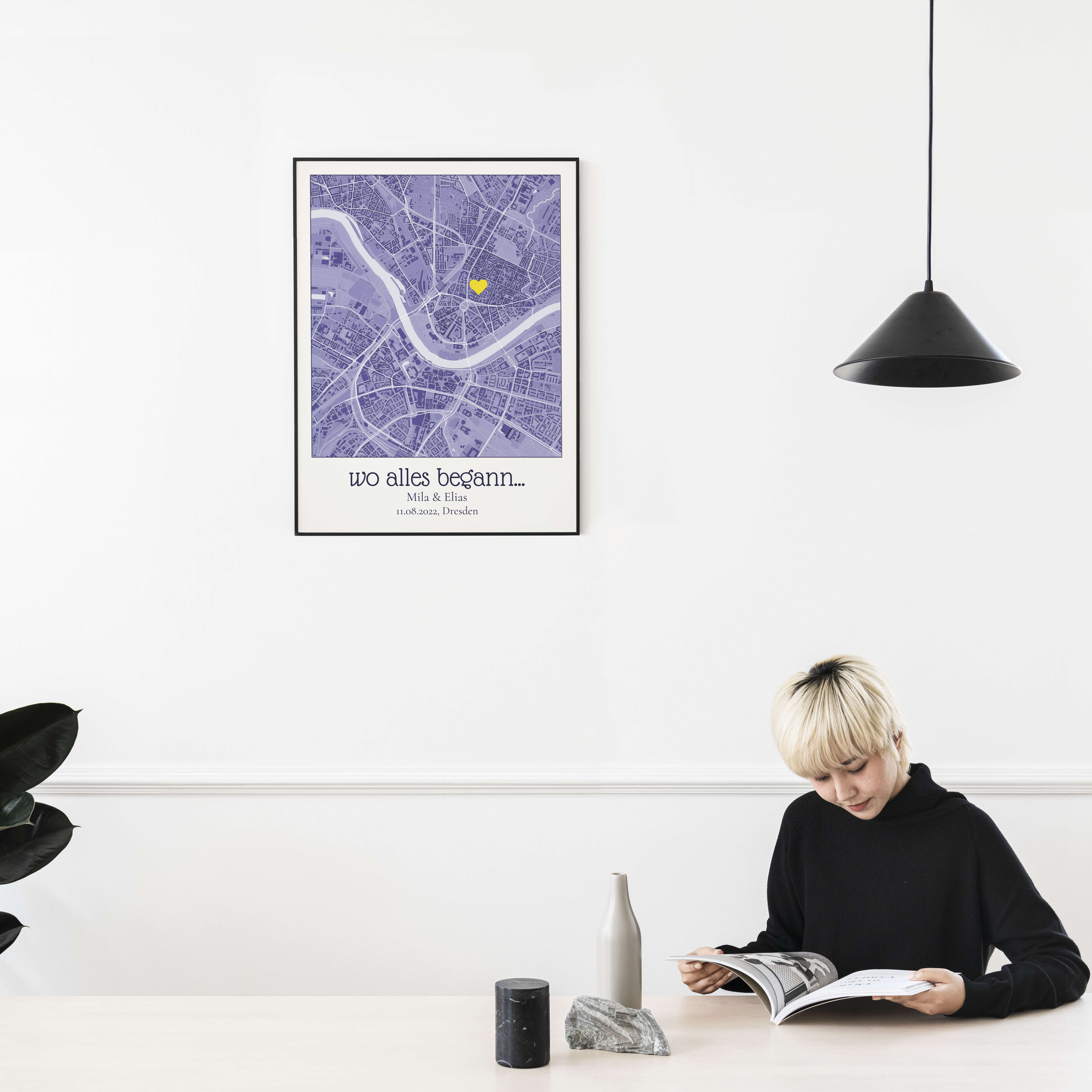 Erstelle deine eigene personalisierte Karte und schenke einem geliebten Menschen oder dir selbst eine bleibende Erinnerung an einen besonderen Ort oder Moment. Unsere personalisierte Landkarte „Wo alles begann“ zeigt eine stilisierte Karte von Dresden, ergänzt mit persönlichen Details wie Namen, Datum und einem speziellen Marker. Als perfektes Geschenk für Paare, Freunde oder Familie bietet diese Karte emotionale Bedeutung und Stil für jeden Raum.