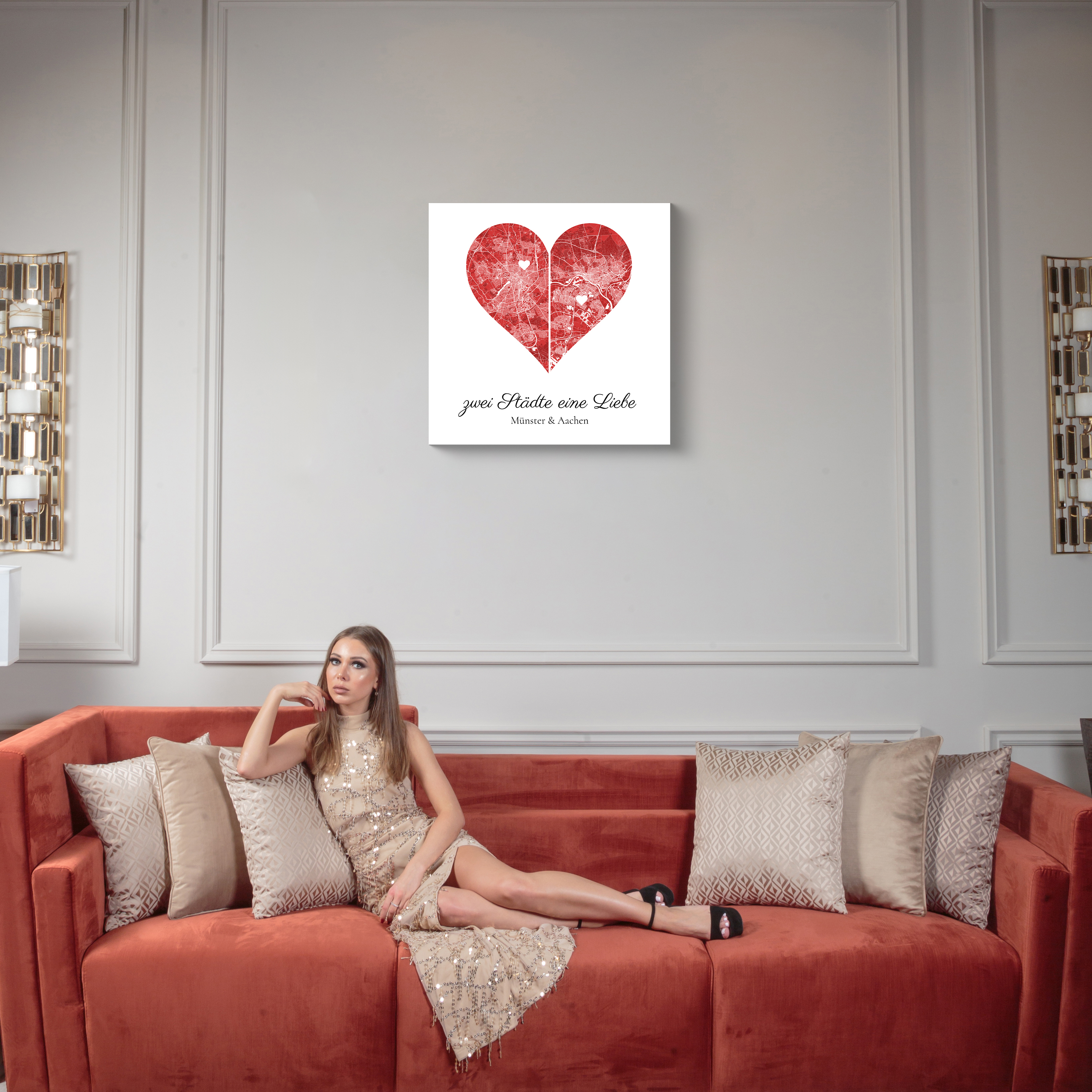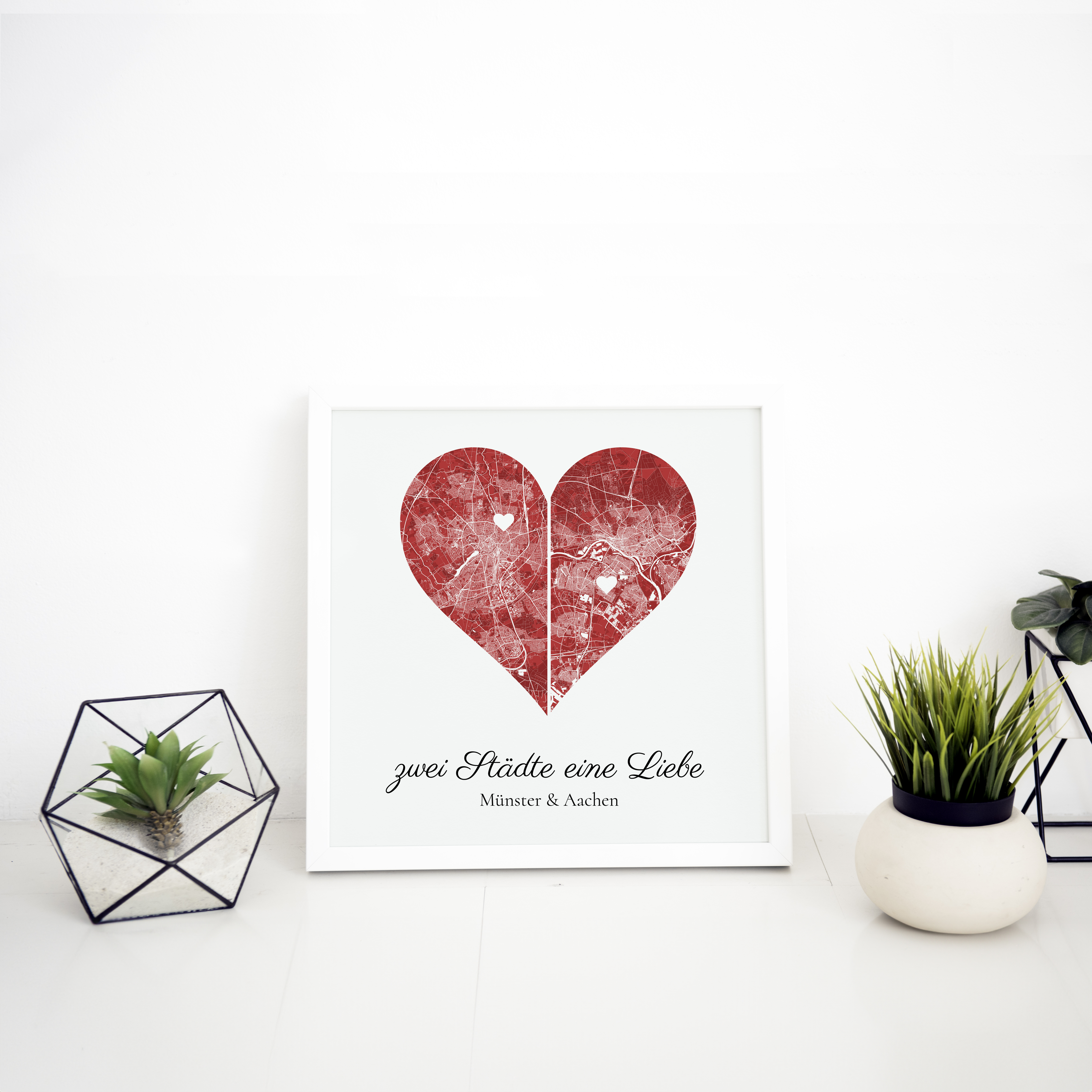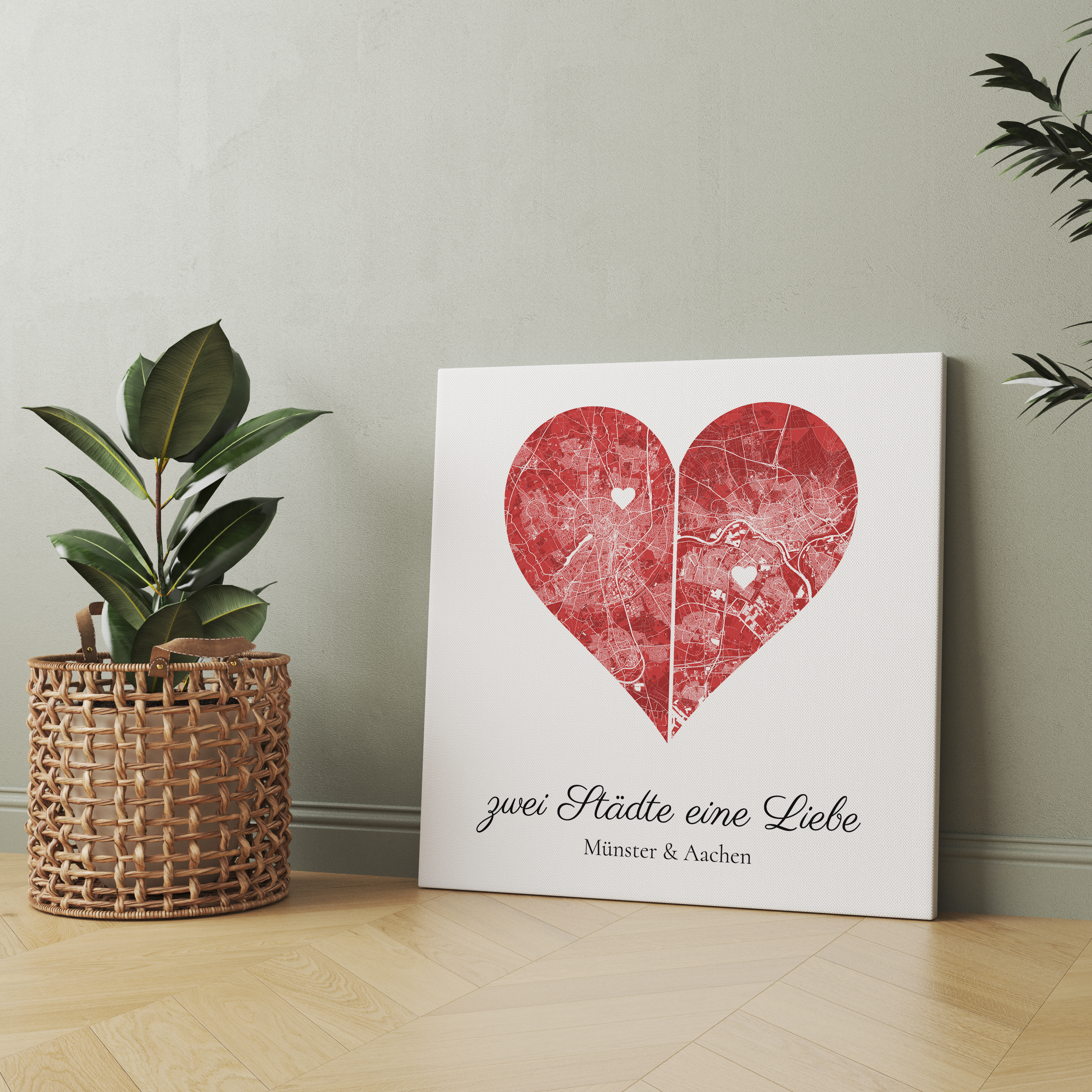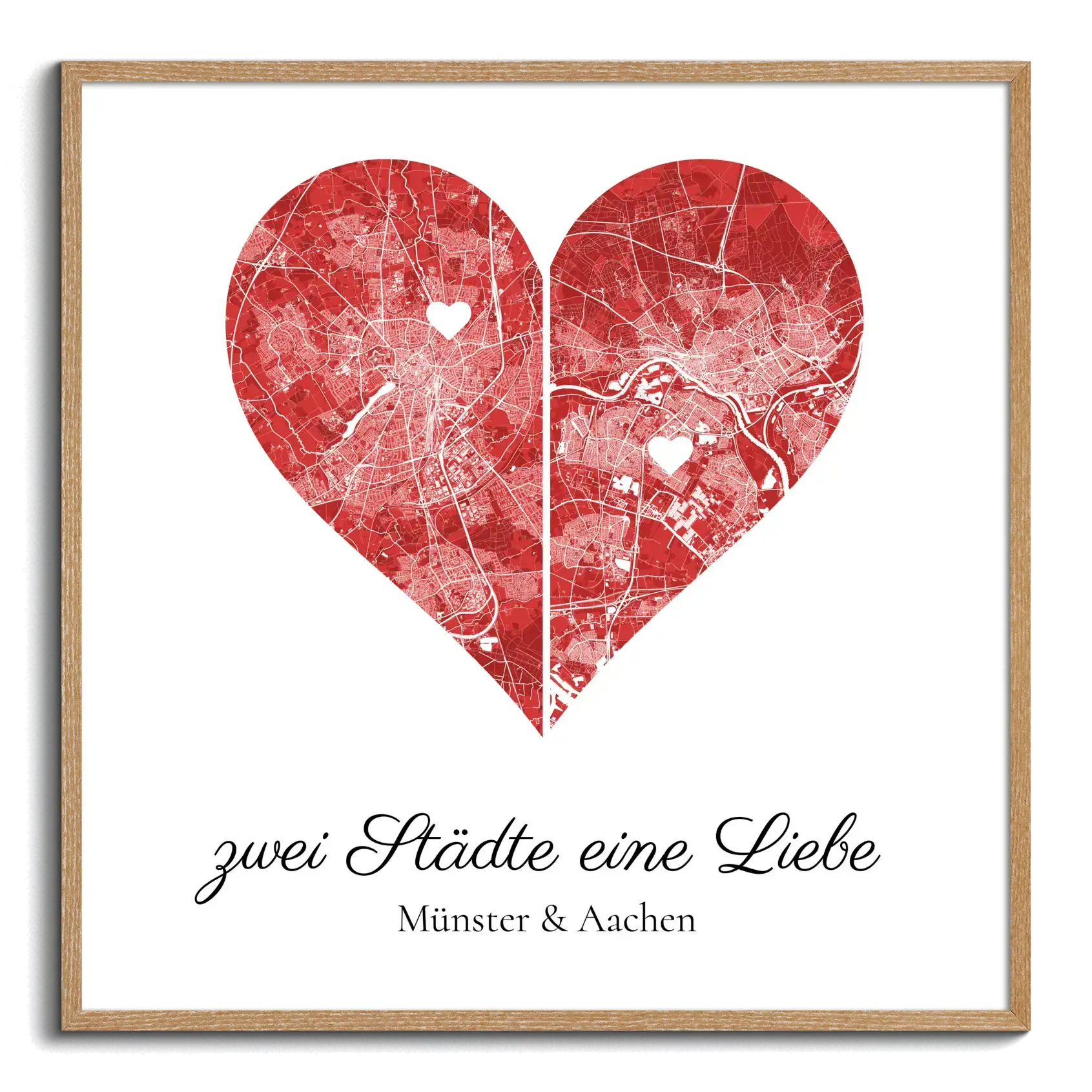 Zwei Städte eine Liebe; personalisierte Stadtkarte mit zwei Orten; Druck auf Poster, gerahmt, Leinwand, Acryl oder Alu-Dibond